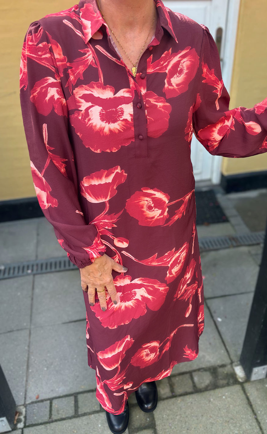 Kjole fra Say INA Copenhagen Smuk kjole fra Say INA Copenhagen i burgundy med blomster. Kjolen har lange ærmer med elastik ved håndled, en åbning med knapper fortil og en god længde. Kjolen kan styles både til hverdag og særlige lejligheder Brystmål i cm